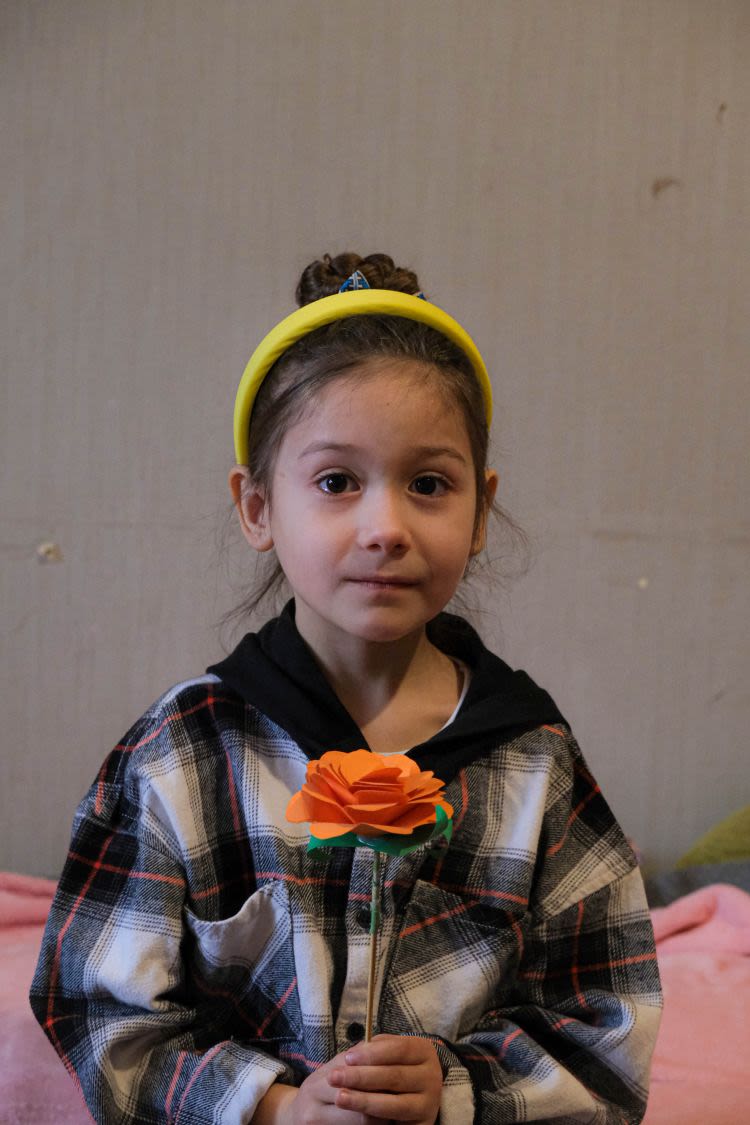 Kateryna’s daughter holds a paper flower she made with her kindergarten teacher. Photo: Zaynab Mayladan/NRC