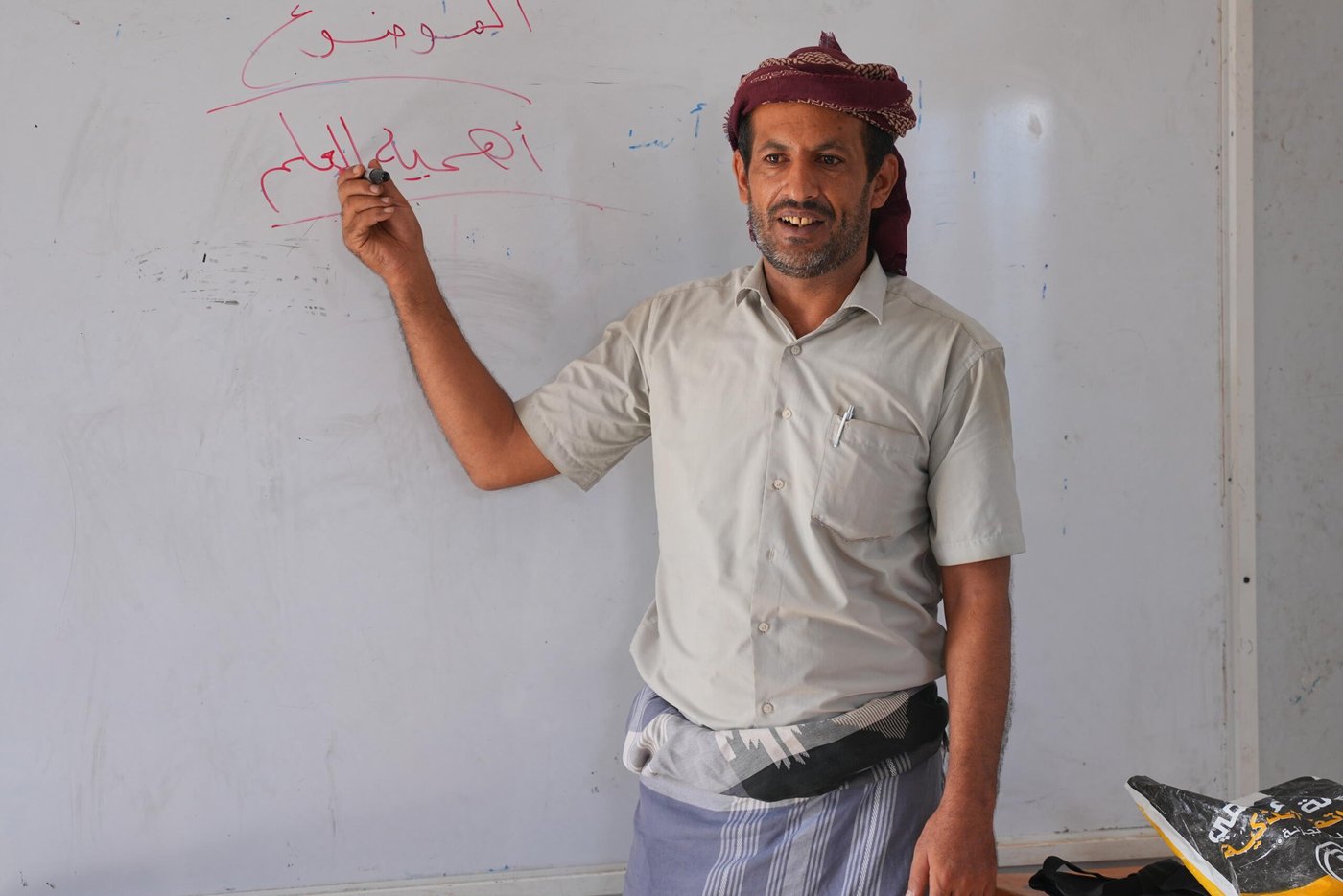 Gazem, 36, holds a diploma in administration. Driven by a desire to help, he began teaching at the Abu Obaida School in Marib four years ago, despite lacking formal training and teaching experience.