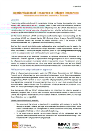 From the perspective of NRC and IMPACT Initiatives, it is essential that there be a common set of criteria and a collective approach to reprioritization in refugee responses to ensure we are reaching the refugees whose needs are most acute with the resources that remain. This document aims to support discussions on this issue and offers some initial joint reflections from NRC and IMPACT Initiatives, including a series of questions we believe would be useful to understand from UNHCR.