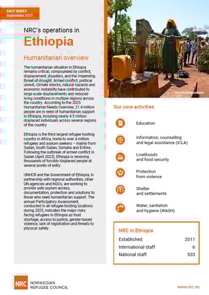 Facts and figures NRC Ethiopia | Fact sheet l Ethiopia Country fact sheet The humanitarian situation in Ethiopia remains critical, compounded by conflict, displacement, disasters, and the impending threat of drought. The Norwegian Refugee Council (NRC) has provided assistance since 2011. Download factsheet (September 2025)