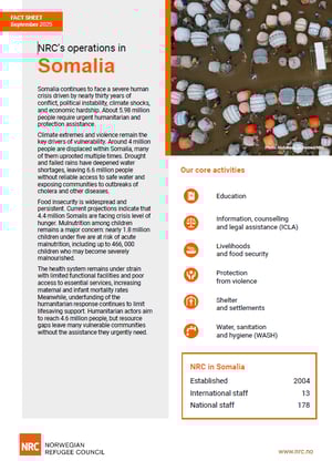 Facts and figures NRC Somalia | Fact sheet l Somalia Country fact sheet Somalia continues to face a severe humanitarian crisis driven by nearly 30 years of conflict, political instability, climate shocks and economic hardship. Almost 6 million people require urgent humanitarian and protection assistance. Download fact sheet (September 2025)