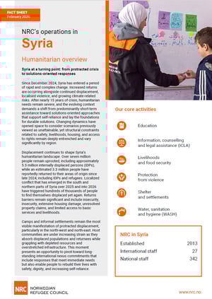 Facts and figures NRC Syria | Fact sheet l Syria Country fact sheet The Norwegian Refugee Council (NRC) is one of only a few INGOs with operations throughout all of Syria, with offices across northern, southern and central regions. We assisted 606,622 individuals across Syria in 2025. Download fact sheet (February 2026)