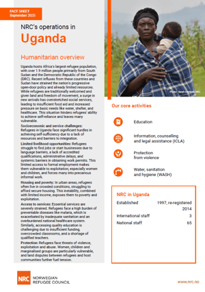Facts and figures NRC Uganda | Fact sheet l Uganda Country fact sheet Uganda hosts over 1.9 million refugees and asylum seekers. The Norwegian Refugee Council (NRC) gives both life-saving and long-term support to refugees from Sudan, South Sudan, DR Congo and Burundi. Download fact sheet (September 2025)