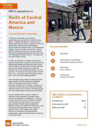 Facts and figures NRC North of Central America and Mexico | Fact sheet l El Salvador Honduras Mexico Country fact sheet El Salvador, Guatemala, Honduras and Mexico continue to face widespread violence linked to organised crime and gangs, deep-rooted poverty and inequality, recurrent extreme weather events, and institutional fragility. Download factsheet (February 2026)