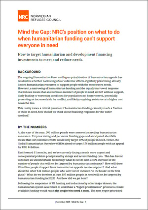 The paper sets out the Norwegian Refugee Council's (NRC) position on how humanitarian funds should be used, where development and other financing must step in, and what changes are required across humanitarian and development aid financing to ensure that people in crisis can access essential services, exercise their rights, and ultimately move towards self-reliance and solutions.