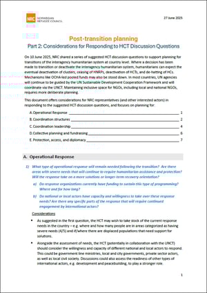 In most countries, UN agencies will continue to be guided by the UN Sustainable Development Cooperation Framework and will coordinate via the UNCT. Maintaining inclusive space for NGOs, including local and national NGOs, requires more deliberate planning. This document offers considerations for NRC representatives (and other interested actors) in responding to the suggested HCT discussion questions.