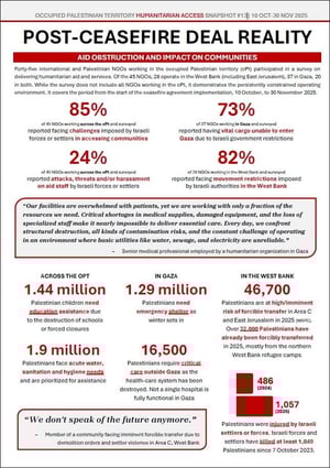 While the survey does not include all NGOs working in the oPt, it demonstrates the persistently constrained operating environment. It covers the period from the start of the ceasefire agreement implementation, 10 October, to 30 November 2025.