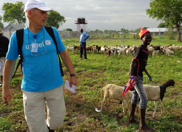 Flyktninghjelpen låner ut sine eksperter i beredskapsstyrken vår NORCAP til andre organisasjoner. Her hjelper vår ekspert Stener Vogt UNICEF med å frigjøre barnesoldater. Barn som har blitt løslatt, får to geiter hver. Målet er at de avler geitene og på den måten får en inntekt. Sør-Sudan, juni 2018. Foto: Stener Vogt/NORCAP