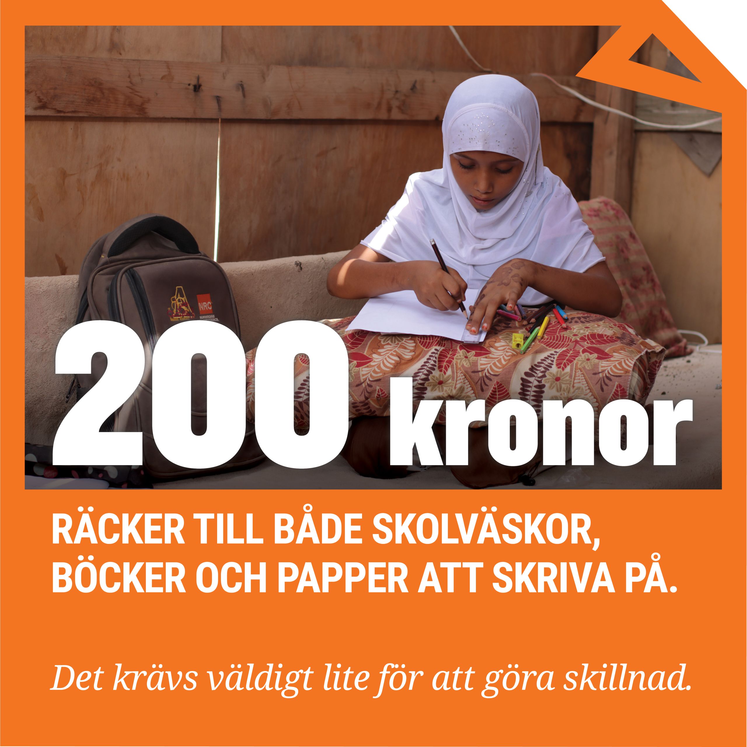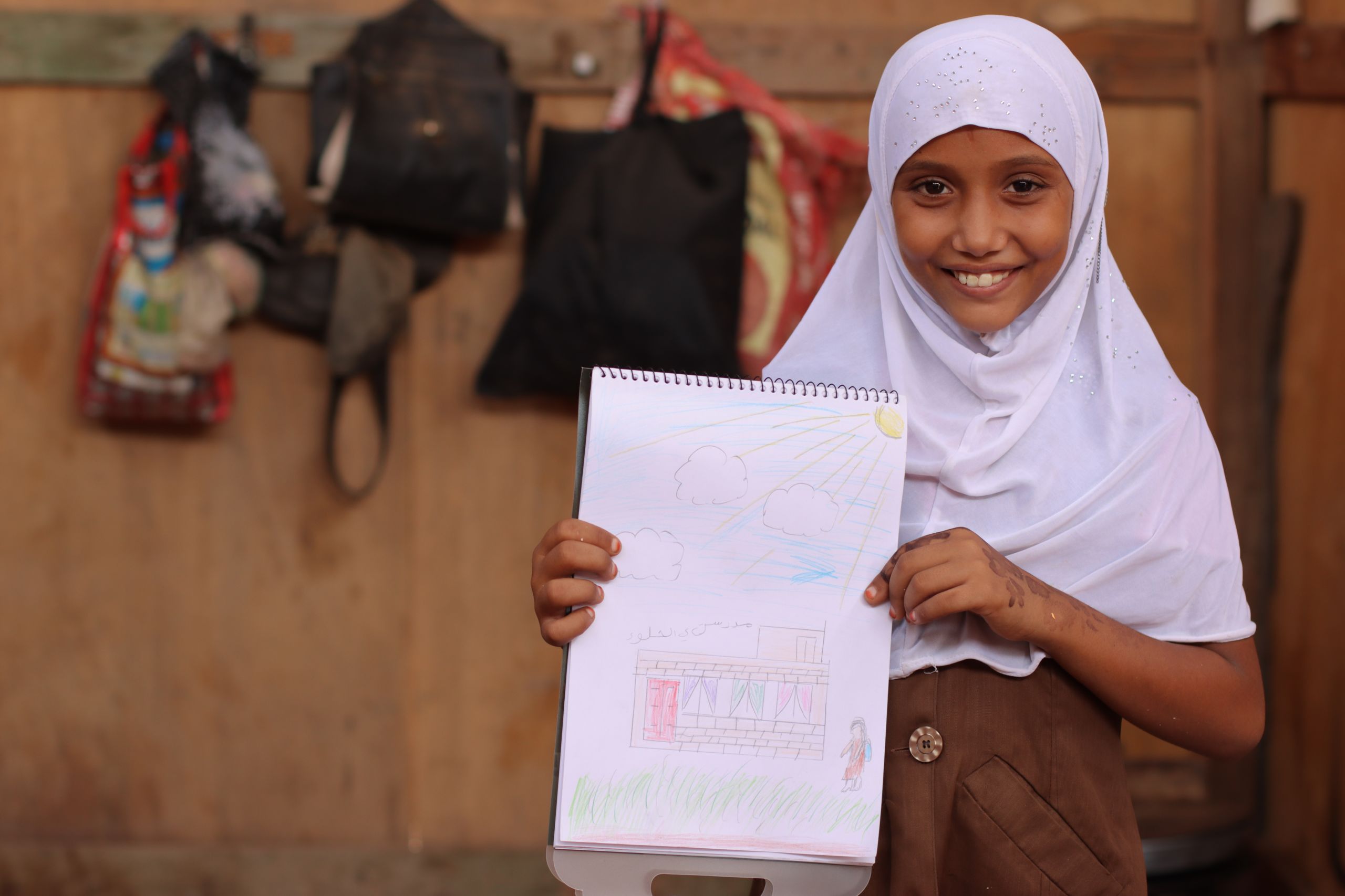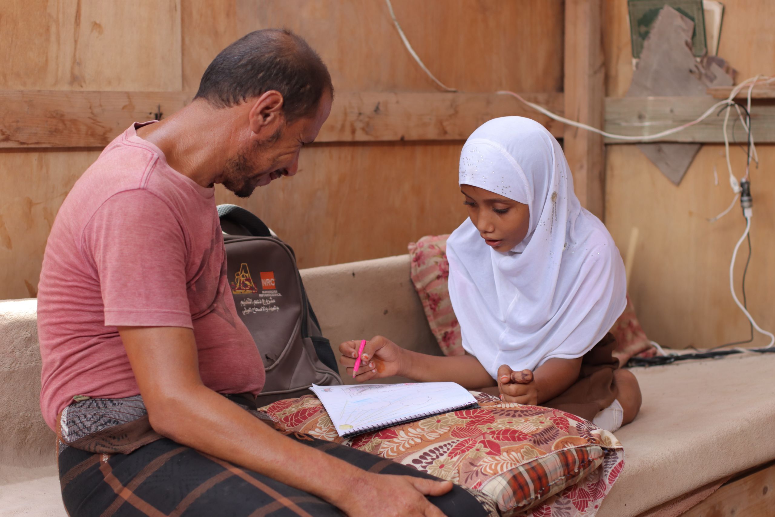 ”NRC Flyktinghjälpen har gjort allt de kan för att hjälpa barnen och förse dem med skolväskor, böcker och skrivmaterial. De har till och med byggt en ny skola”, säger Yamamas pappa Omar och fortsätter stolt: ”Yamama älskar skolan och tillbringar större delen av sin fritid hemma där hon gör sina läxor och läser och ritar. Nu är hon bäst i klassen.”
