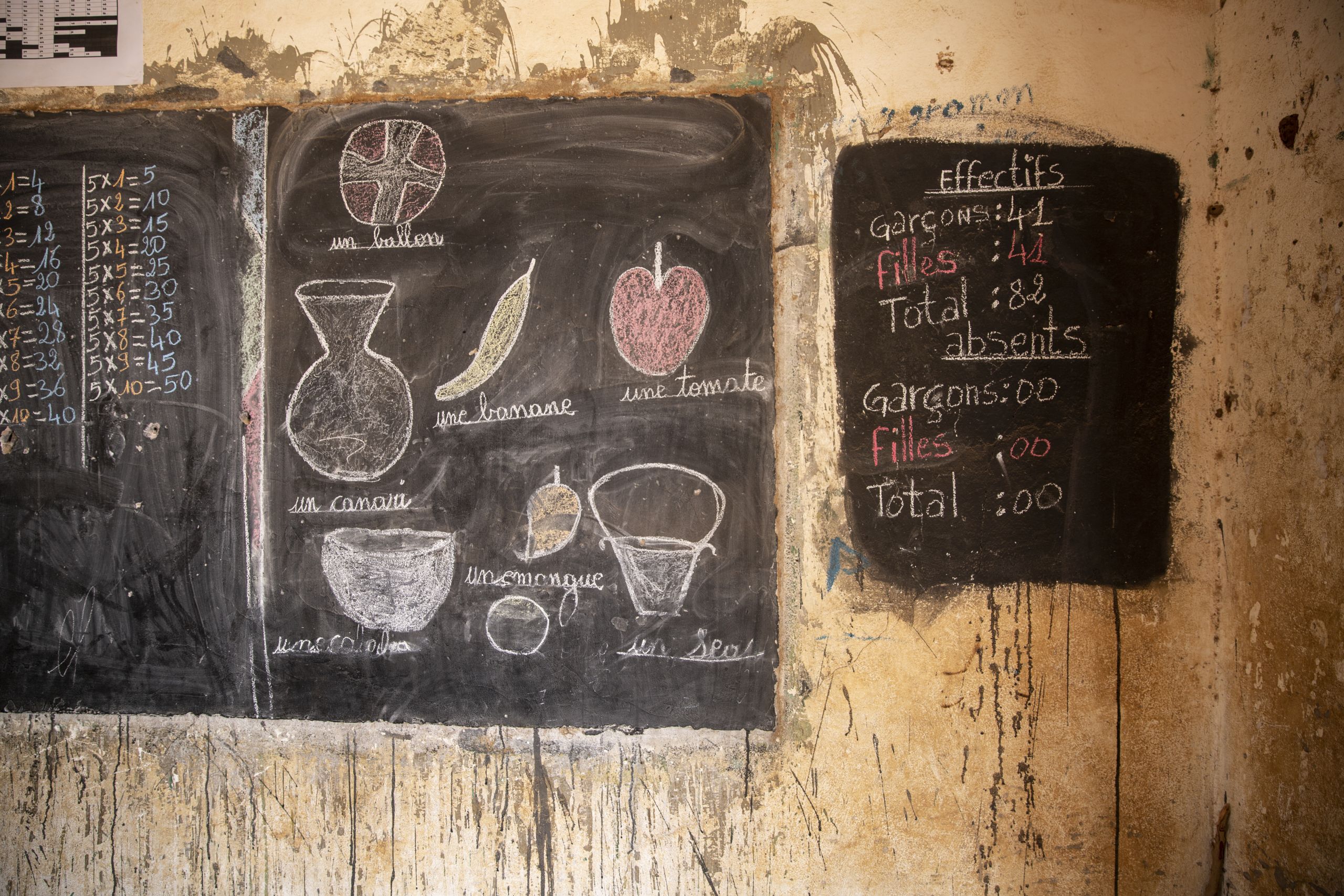 Attendance is high these days, as recorded on this blackboard. Every one of the 82 children in Saïbata’s grade 2 class showed up the day we visited.