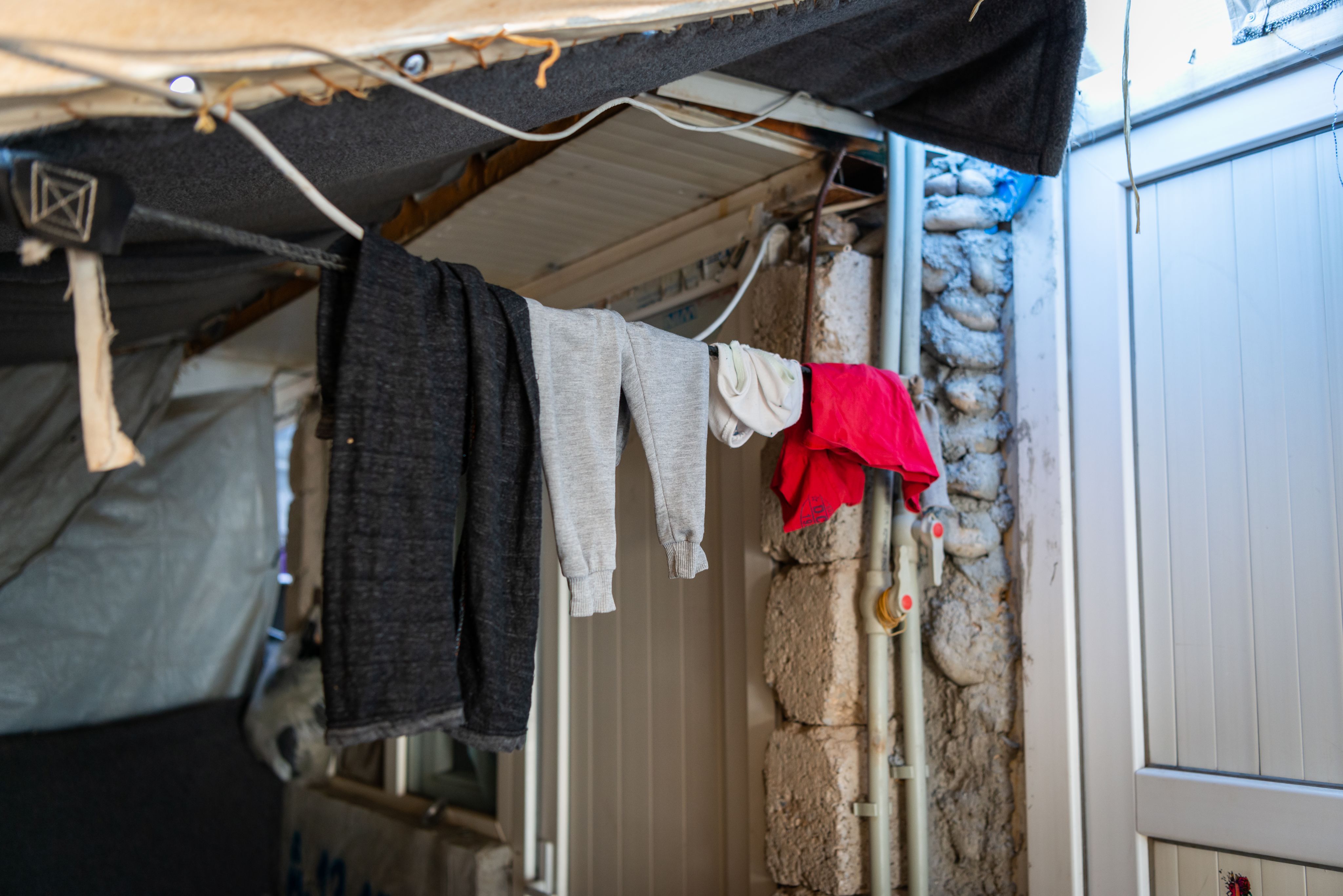 På golvet ligger en matta. Längs tältets väggar finns några madrasser. I övrigt innehåller tältet ingenting mer än en TV, som är en present från en släkting. Utanför dörren finns en smal hall där familjens skor står uppradade.