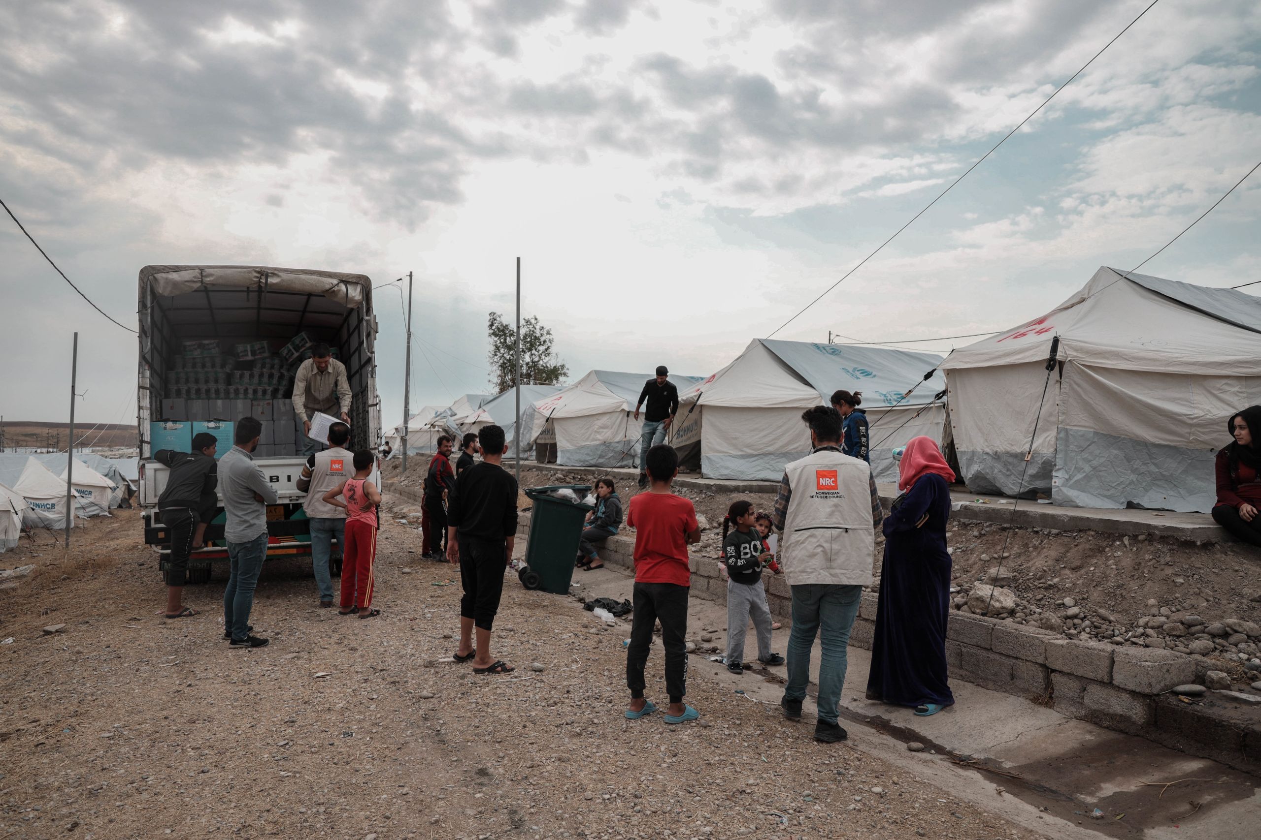 NRC truck going tent by tent to distribute hygiene kit to newly arrived Syrians in the Bardarash camp on 26 October 2019. Photo: Alan Ayoubi/NRC