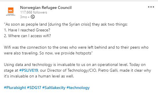 Pluralsight, a corporate partner of NRC, hosted their annual event Pluralsight Live on 27-29 August in Salt Lake City. Our CIO, Pietro Galli, took part in one of the sessions to speak about how technology is revolutionising NRC’s work and uplifting the communities we support around the world.