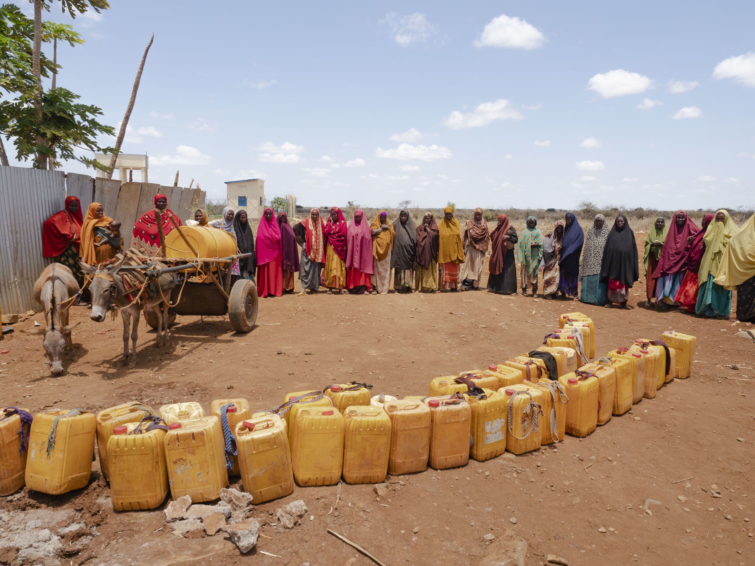 People queue at a water installation in Baidoa, which has been built to support both displaced people and the local population, all of whom would otherwise have limited access to safe water. Photo: Ingrid Prestetun/NRC