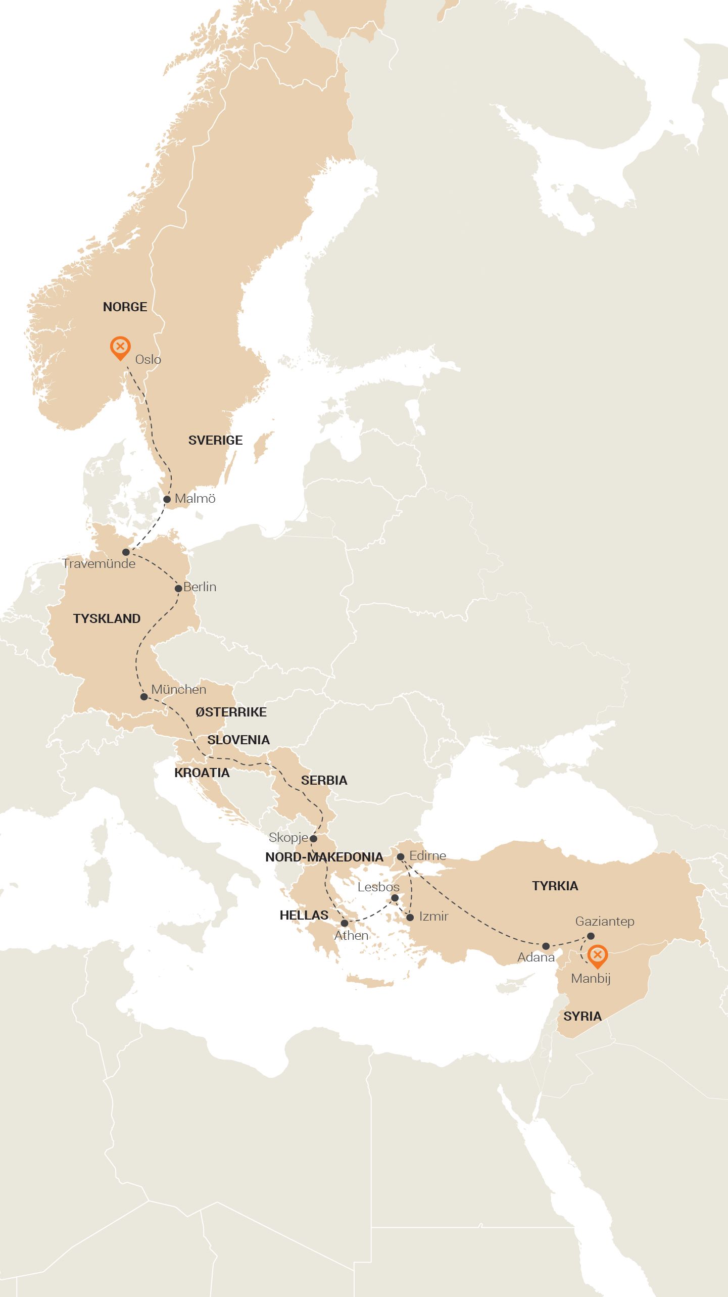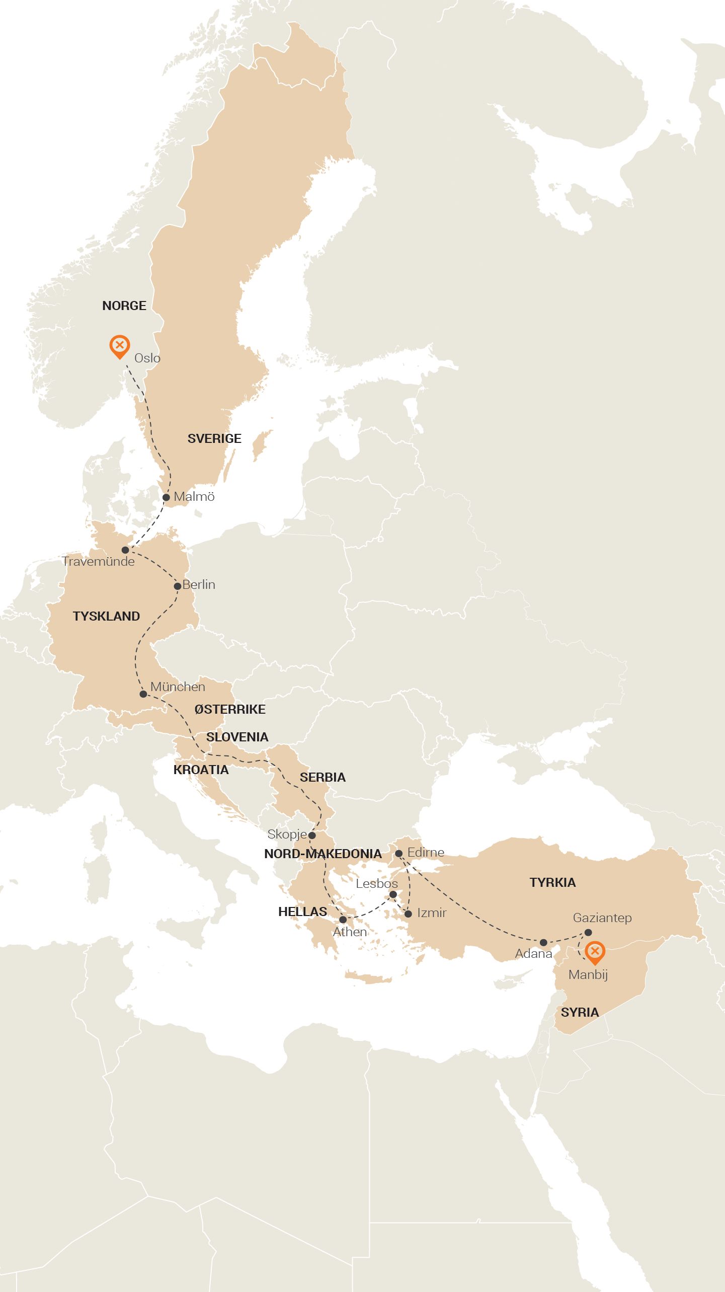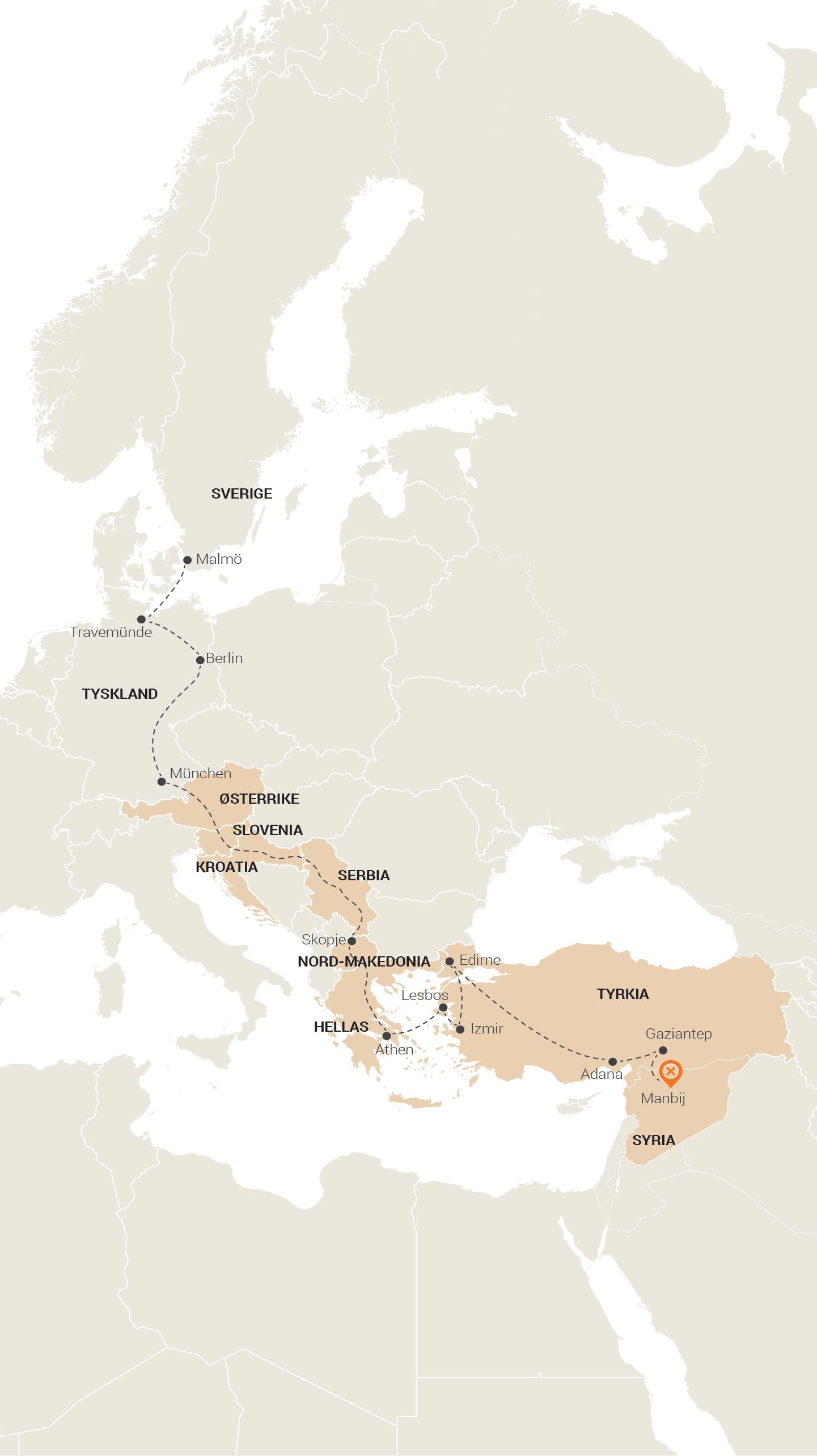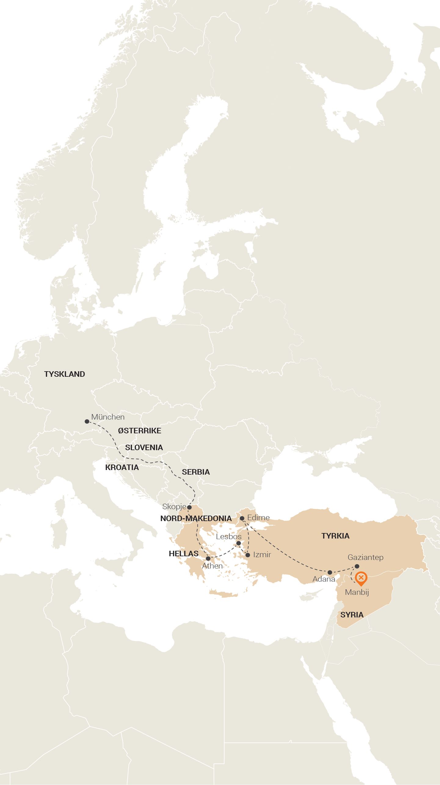 Han gikk gjennom Makedonia, Serbia, Kroatia, Slovenia, Østerrike og til Tyskland – nærmere bestemt München.
