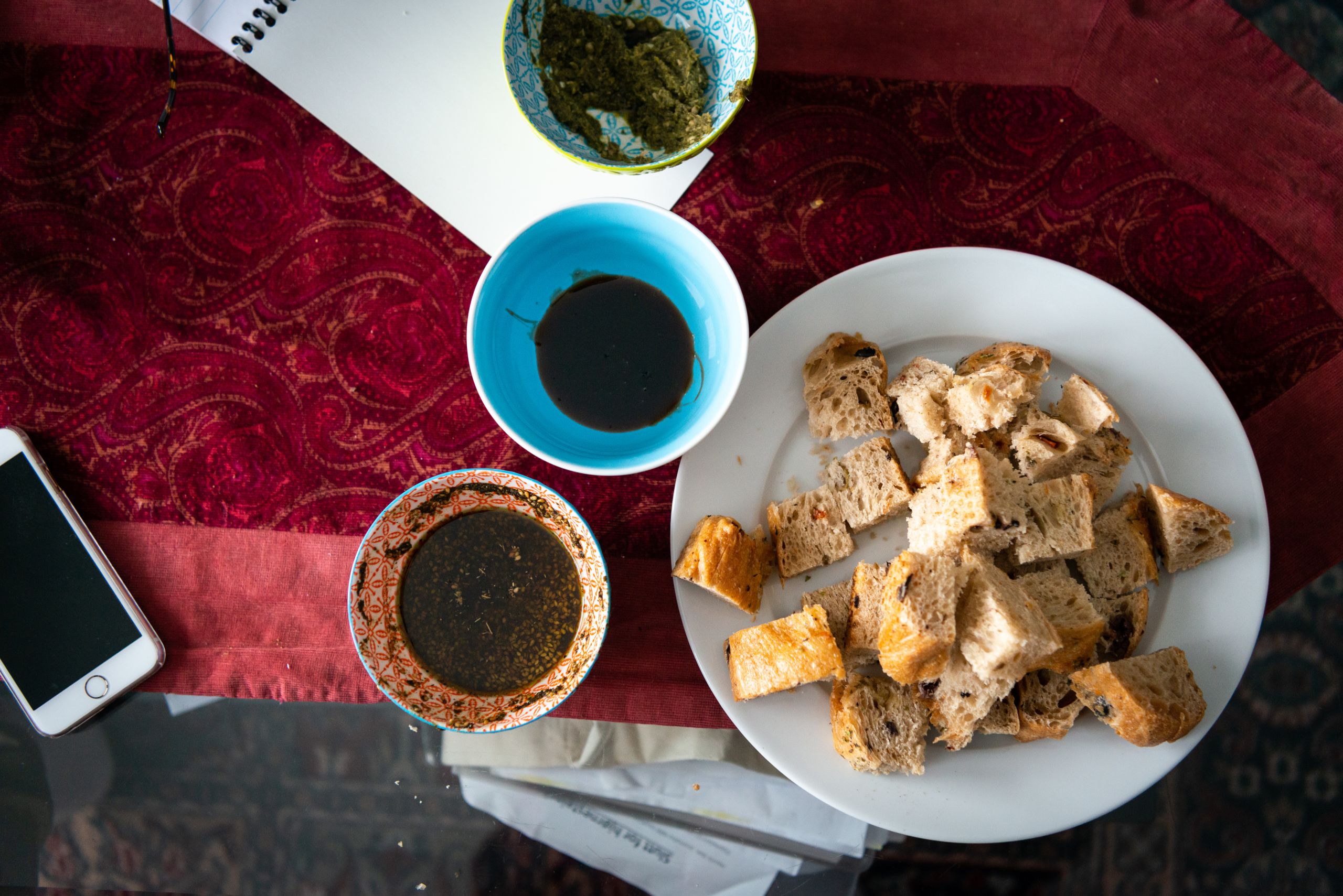 Han reiser seg fra stolen og går ut på kjøkkenet for å skjære opp brød. Kommer tilbake og setter fatet med brød på salongbordet, sammen med tre små skåler med ulike dipper. Den ene dippen har han laget selv: