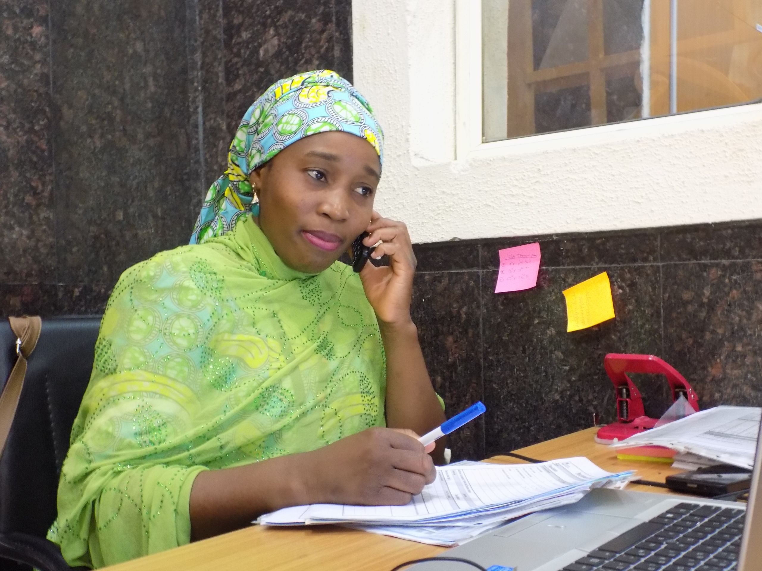 Papirarbeid er en del av jobben som hjelpearbeider. Fanta jobber på kontoret i Nigeria. Foto: Rosalyn Velds/Flyktninghjelpen