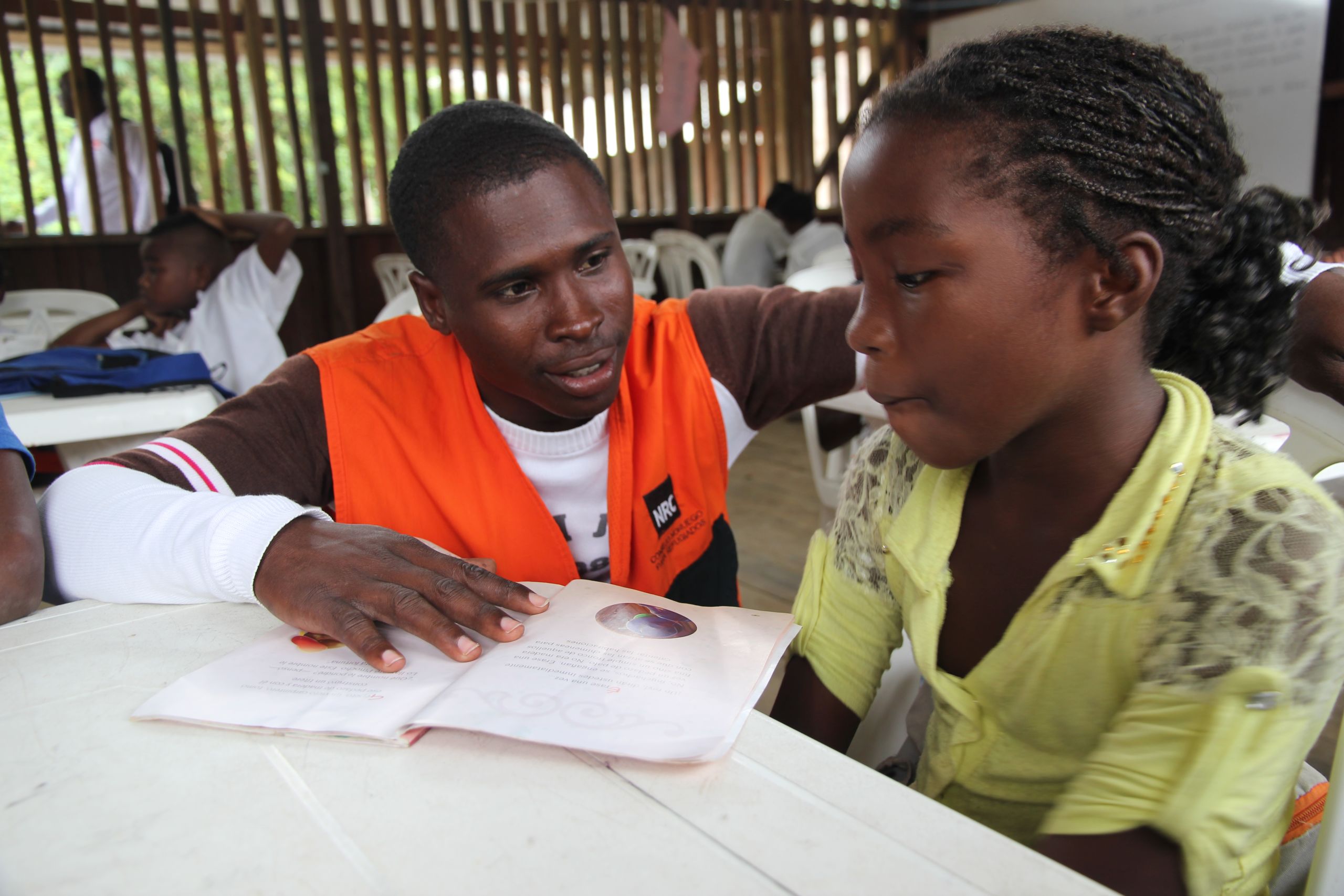 Flyktninghjelpens medarbeider, Jimm, hjelper Jacqueline i en skoletime i Cauca-området, Colombia. Cauca er et av de områdene i landet som har blitt hardest rammet av konflikt. Foto: Ingrid Prestetun/Flyktninghjelpen