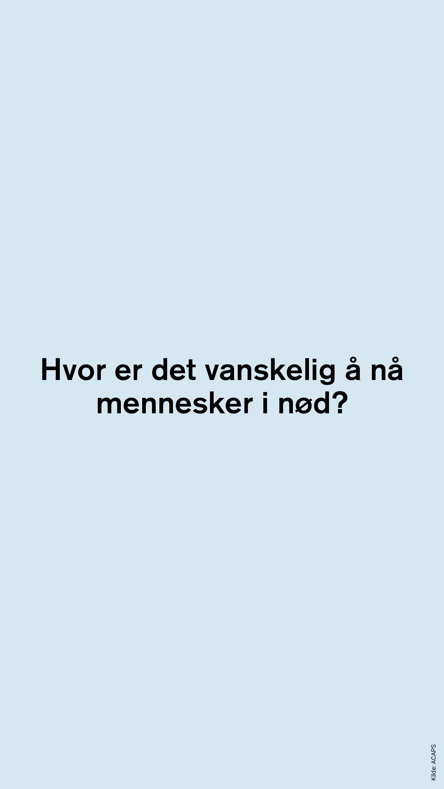 36,4 millioner mennesker som hadde behov for humanitær hjelp i 2017, fikk det ikke. Desto vanskeligere det er å nå et område, desto mindre sannsynlighet er det for at mennesker i dette området får hjelp. Likevel er det ofte i nettopp disse områdene behovene er størst.