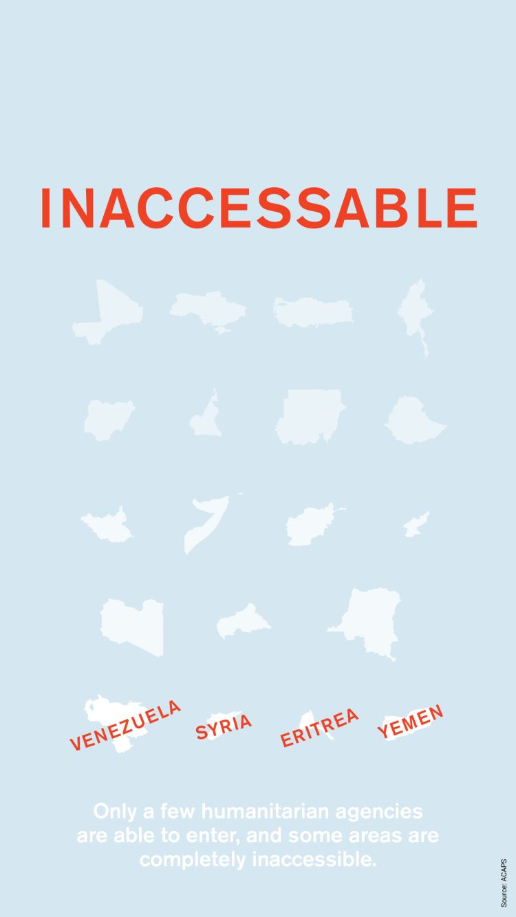 Eritrea, Syria, Venezuela and Yemen are the countries most difficult to reach, according to ACAPS’ Humanitarian access overview. A few humanitarian organisations are able to operate there, but the countries are close to inaccessible for most non-governmental organisations.