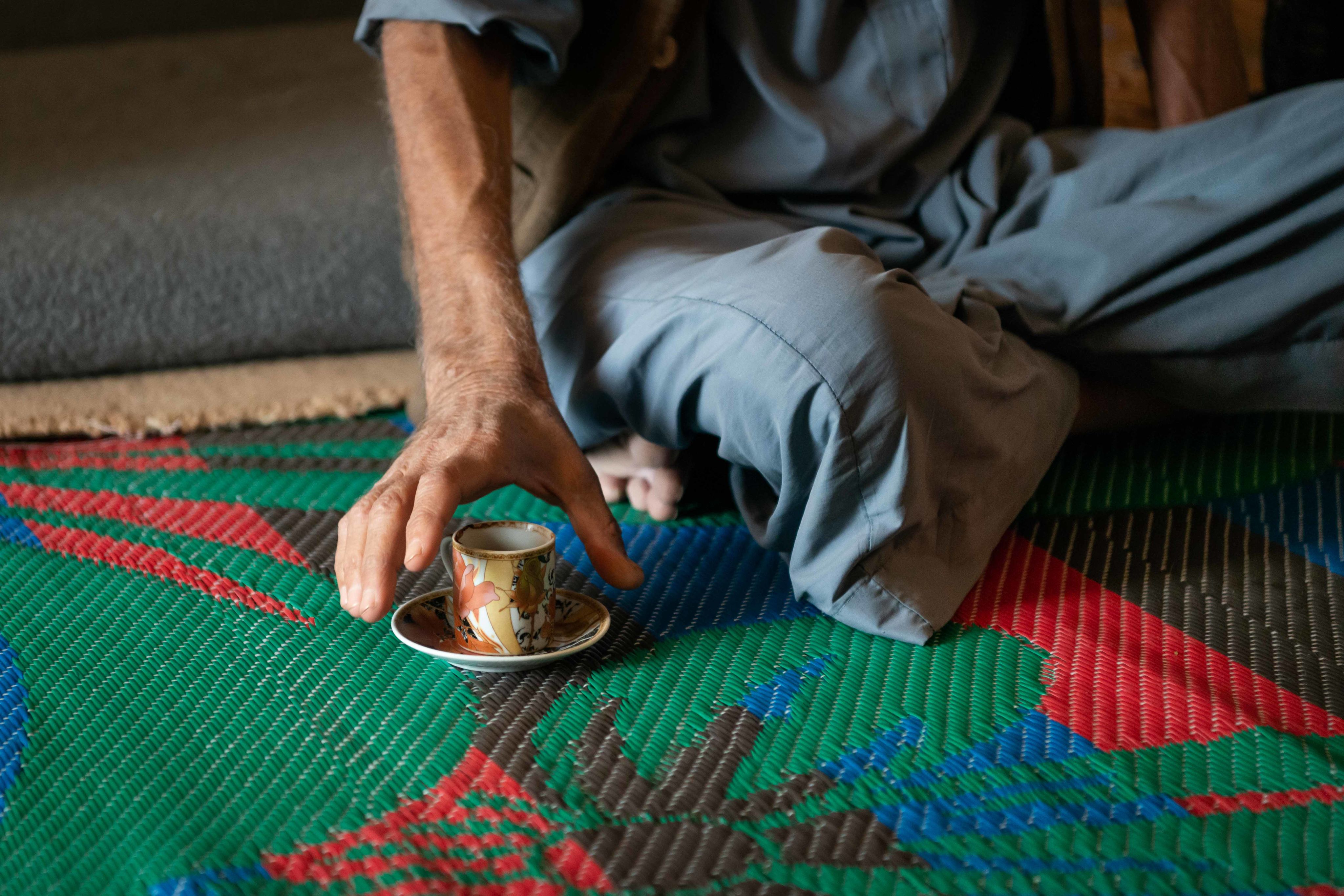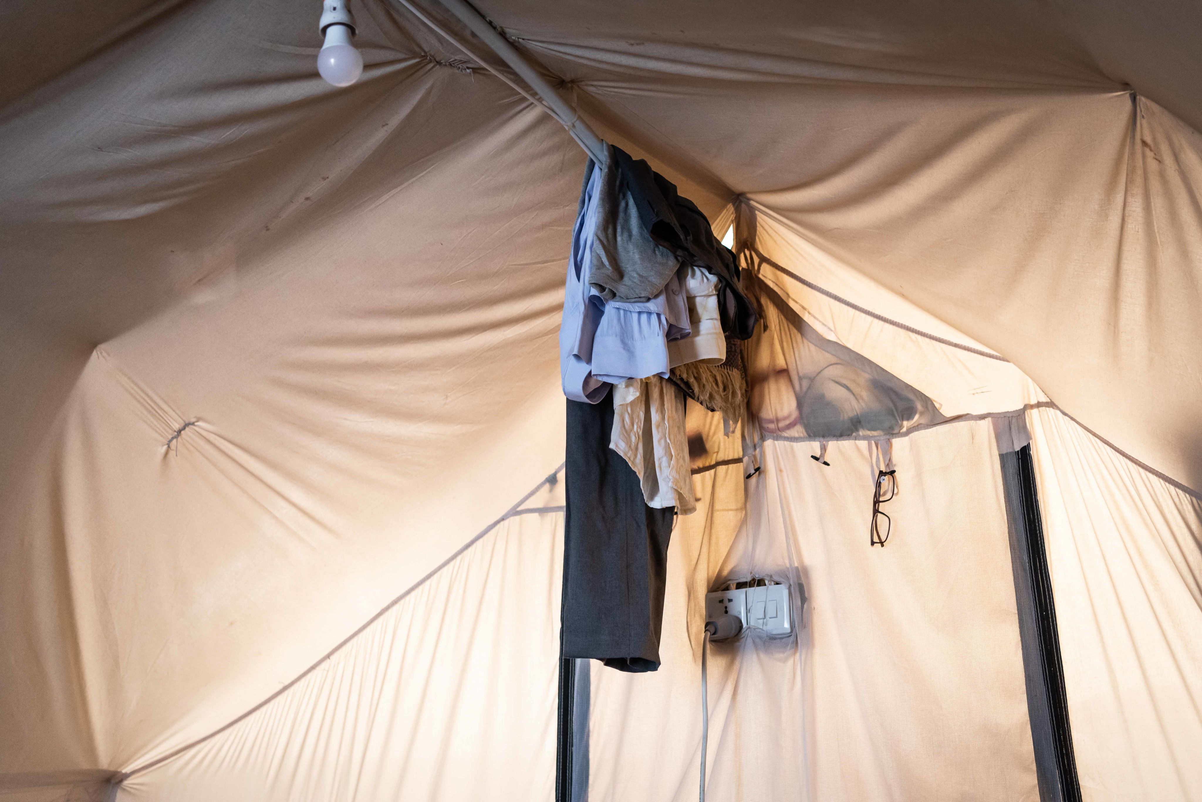 Mohamed, 65, puts his coffee cup down on the saucer, and the gentle clang of the porcelain lingers in the air – a kind of sad accompaniment to the clothes dangling from a line under the tent ceiling. On the floor are a couple of foam mattresses and a carpet.