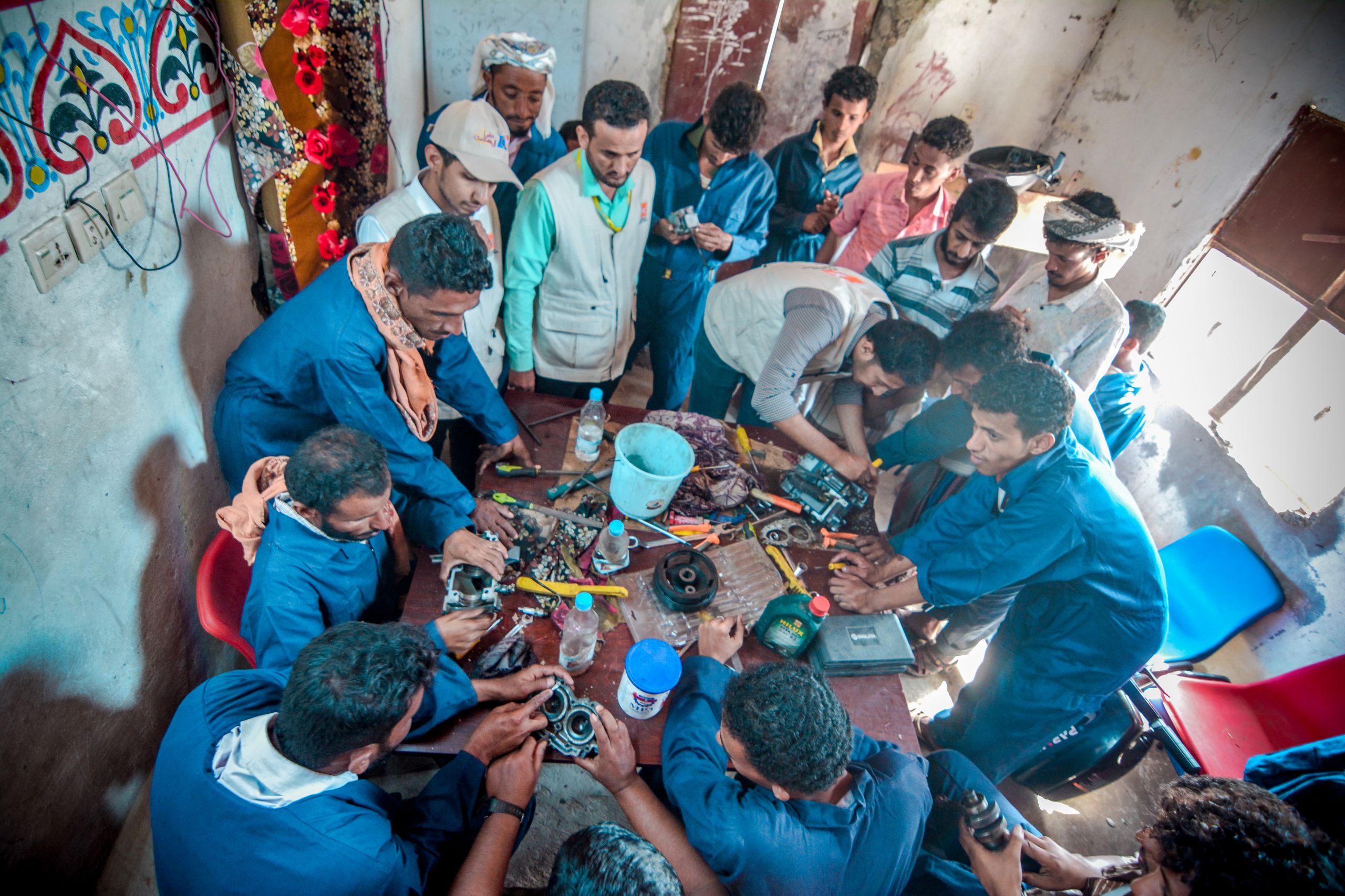 NRC Livelihood Officer Amr Al-Saqqaf explains about boat engine repair and maintenance to a local fisherman.